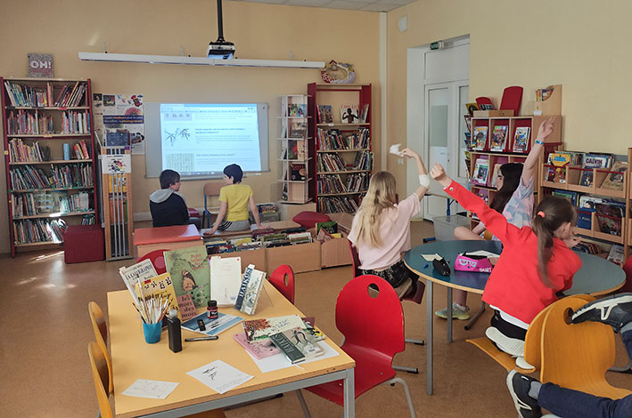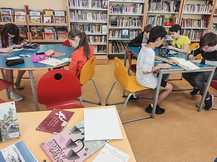Les élèves ont découvert les recueils de haïkus disponibles en BCD, et chacun a choisi un poème à illustrer et à copier en français pour un peu de pratique en calligraphie. La semaine prochaine, en classe verte à Desna, les CM1 et les CM2 pourront réaliser leurs œuvres en atelier Illustration mené par leur professeure documentaliste. (On ne vous en dit pas plus, mais le projet c’est d’en créer un vrai livre !)