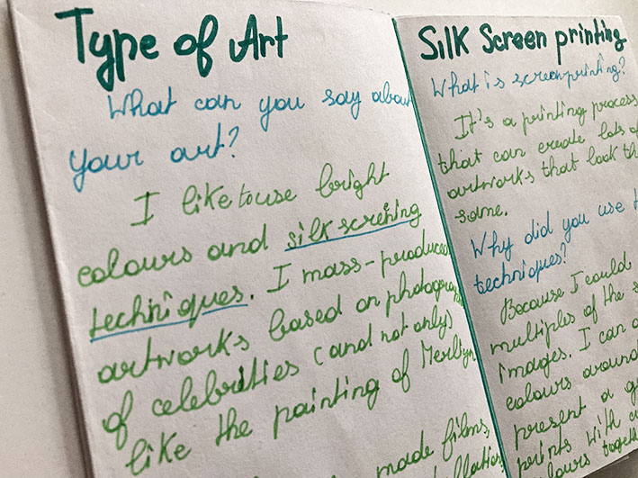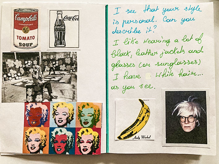 We talked about Roy Lichtenstein, Nicola L, Pauline Boty and other artists, but we mostly concentrated on Andy Warhol, probably the most famous pop artist. His work makes us ask questions like What is art? and Who can be an artist? We explored the map of Manhattan where he lived and worked. We also discussed his famous prints and discovered the silk screen technique which is much more complicated than we had imagined. Finally, we found out about the magazine called Interview – a magazine founded by Andy Warhol in which he wanted to reveal celebrities’ real lives and everyday conversations.