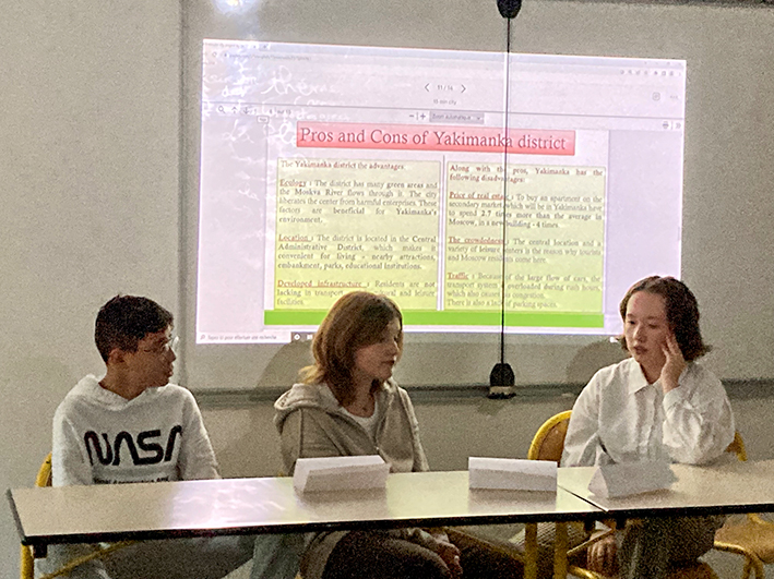 Après une étude des défis que rencontrent les villes modernes, les élèves de 2nde A et B ensemble avec Mme ANTONOVA, professeure d’Anglais ont organisé une conférence sur le projet de la Ville du quart d'heure. Ils ont redécouvert leurs quartiers et ont essayé de répondre à la question suivante : est-ce que Moscou pourrait être une ville du quart d'heure? La conférence a donné lieu à des débats passionnés.